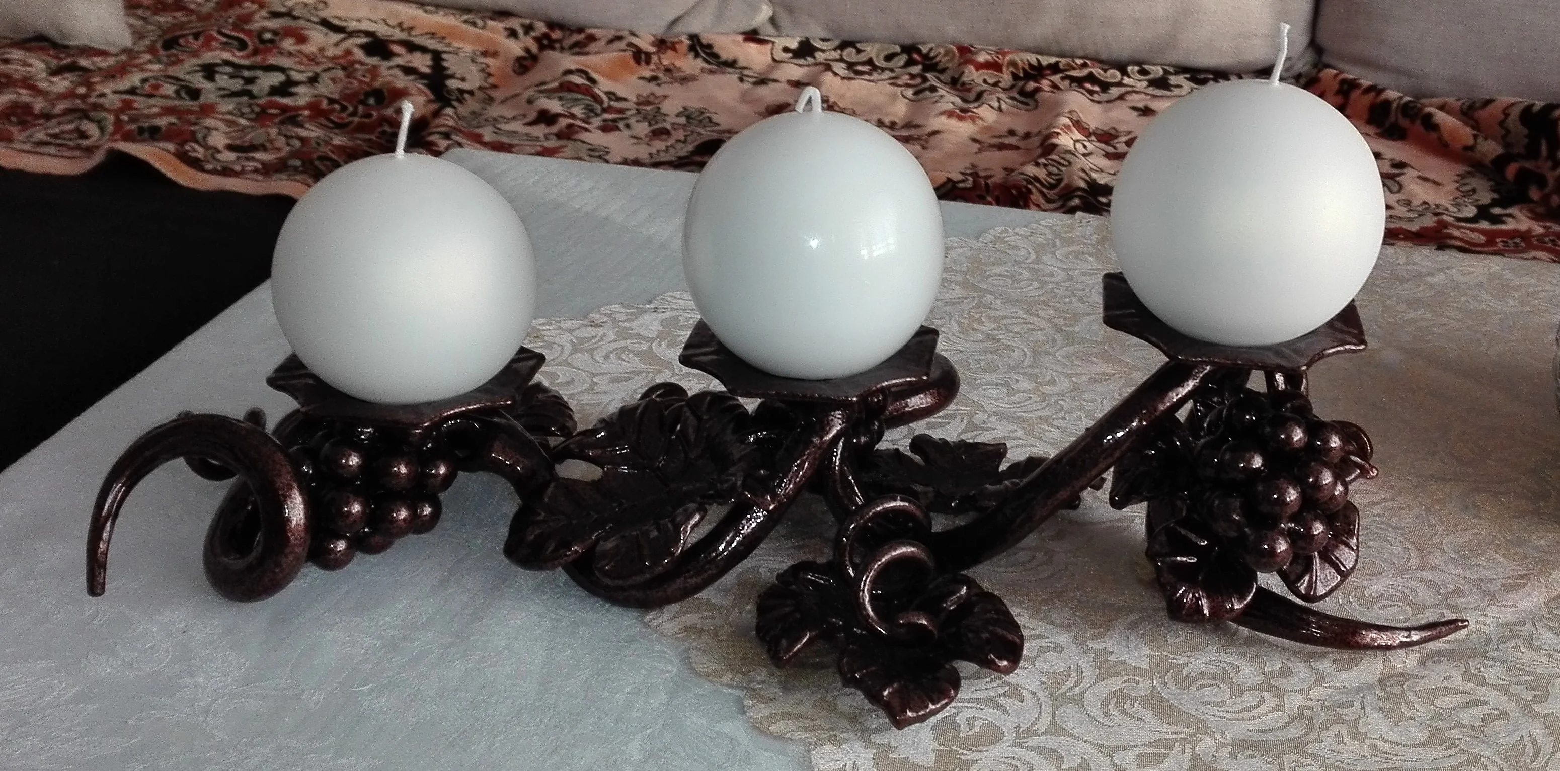 Ręcznie wykonana ozdoba, która wprowadzi nastrój do każdego wnętrza. **Świecznik kuty** z motywem winorośli to małe dzieło sztuki. Kute kiście winogron (wykonane z kulek) oraz precyzyjnie wyprofilowane liście oplatają podstawy pod świece.