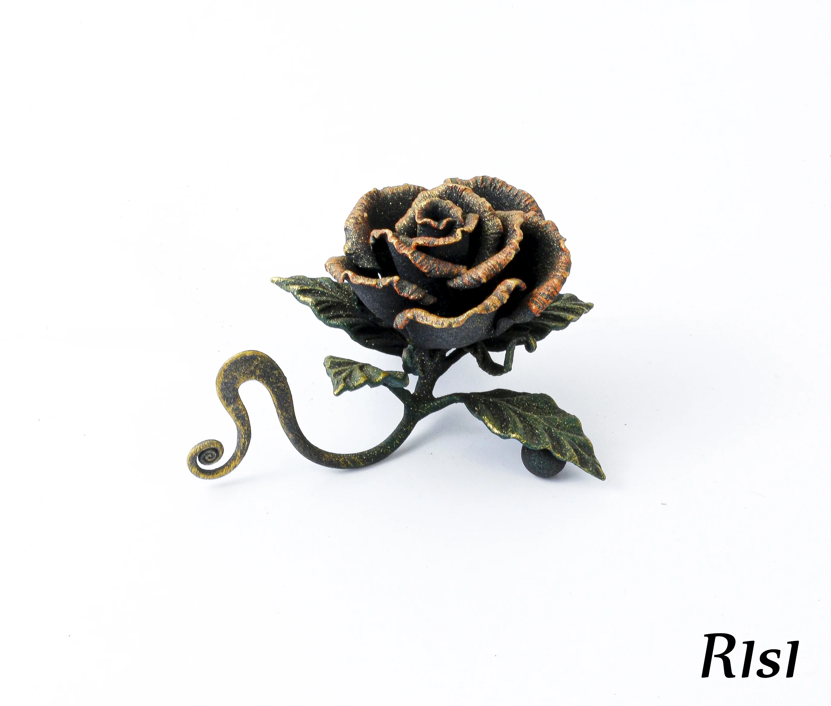 Niewielki, ale urokliwy dodatek. Czerń bazowa została ożywiona ognistą miedzią, co nadaje róży ciepły, jesienny charakter. Niewielkie rozmiary pozwalają na ustawienie go niemal wszędzie.