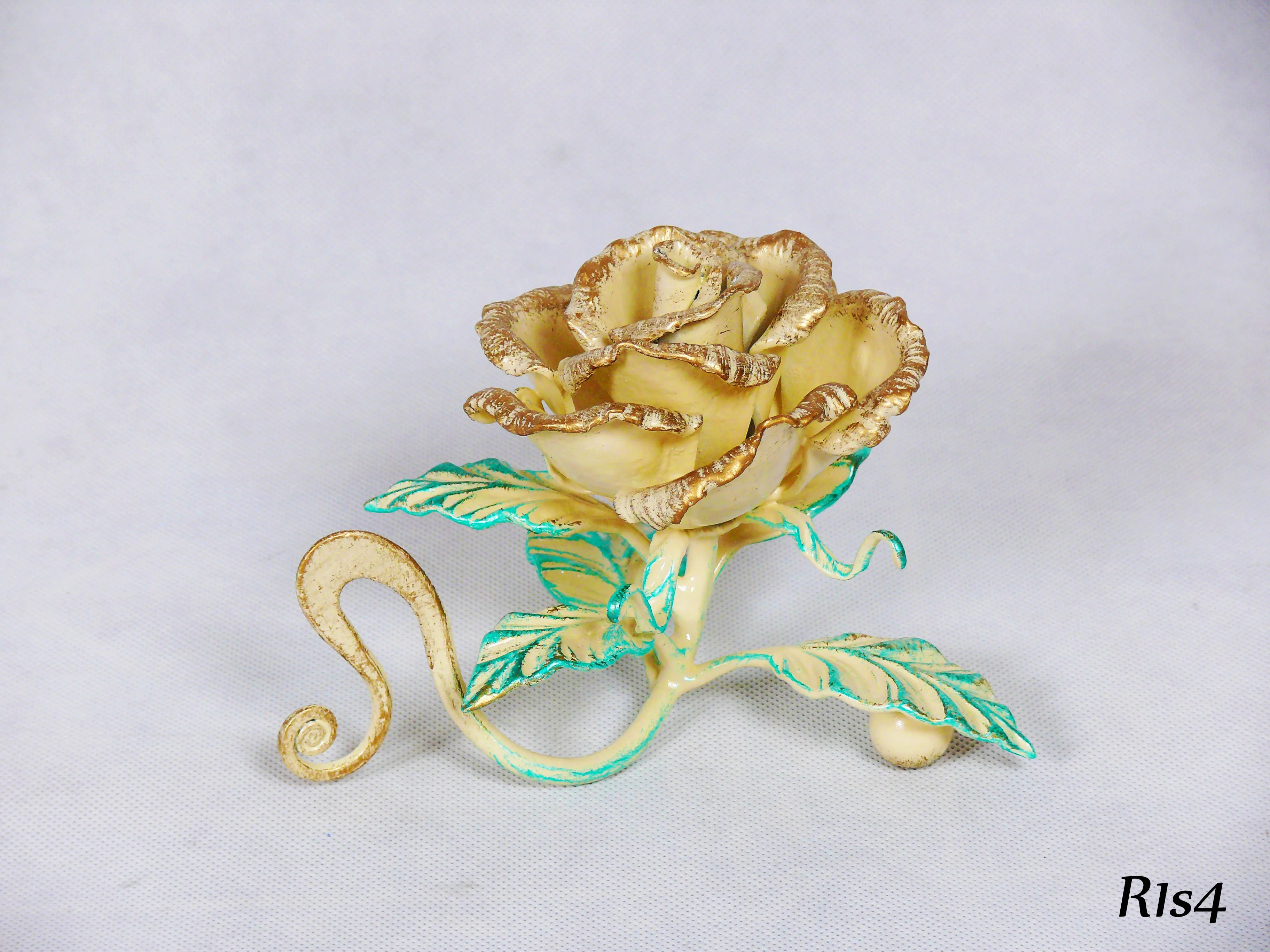 Połączenie delikatności formy z wyrazistym kolorem łodygi. Kwiat w odcieniu jasnego, szlachetnego złota (szampańskiego) stanowi piękny kontrast dla patynowanej na turkusowo podstawy.