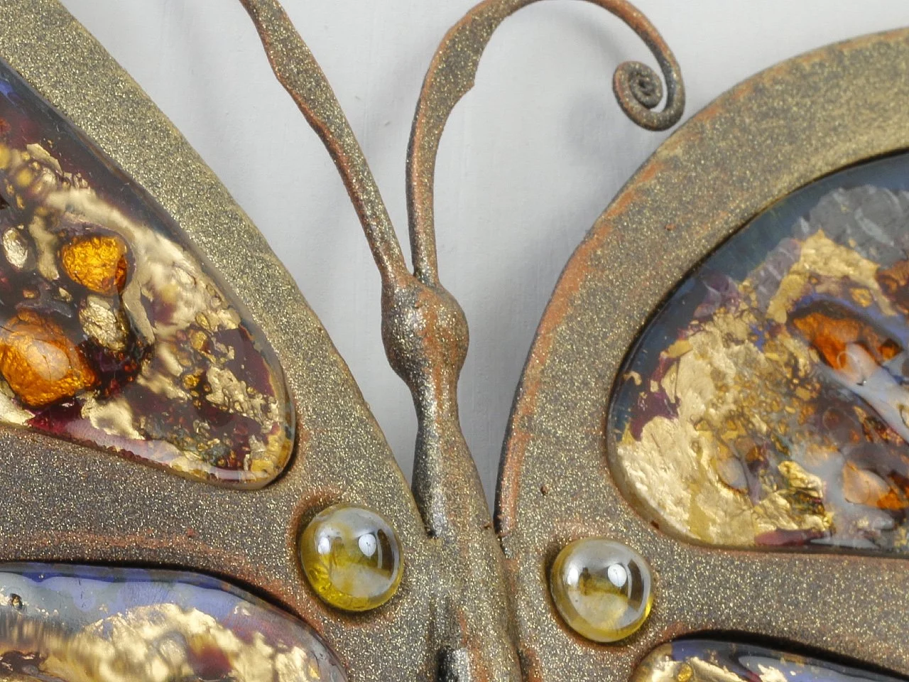 Zbliżenie na skrzydło motyla. Intensywne barwy wtopionego szkła harmonizują ze szlachetną teksturą kutej i patynowanej stali.