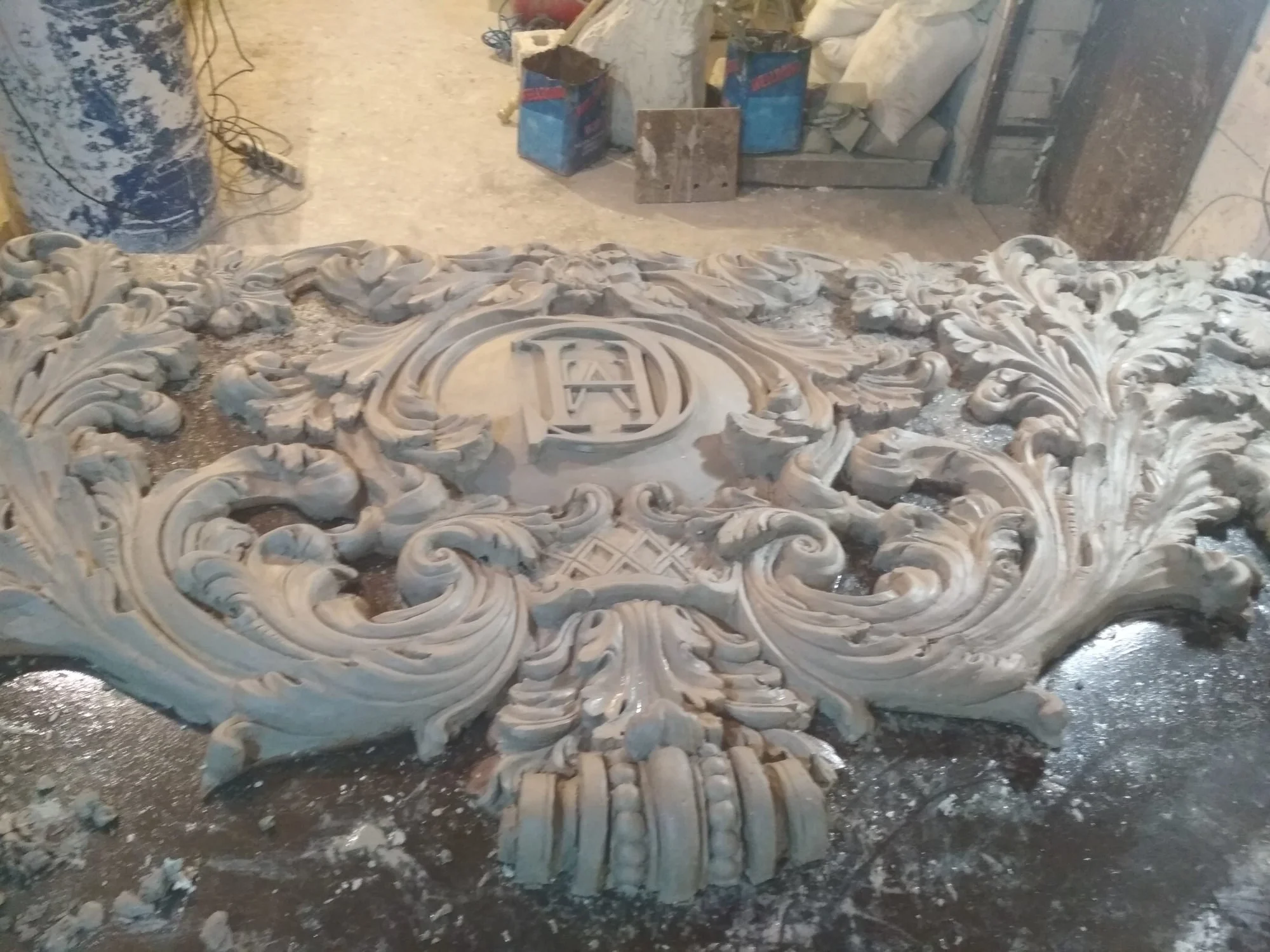 Zdjęcie przedstawia proces powstawania unikalnej dekoracji architektonicznej. Jest to model 1:1 wykonany w glinie.
