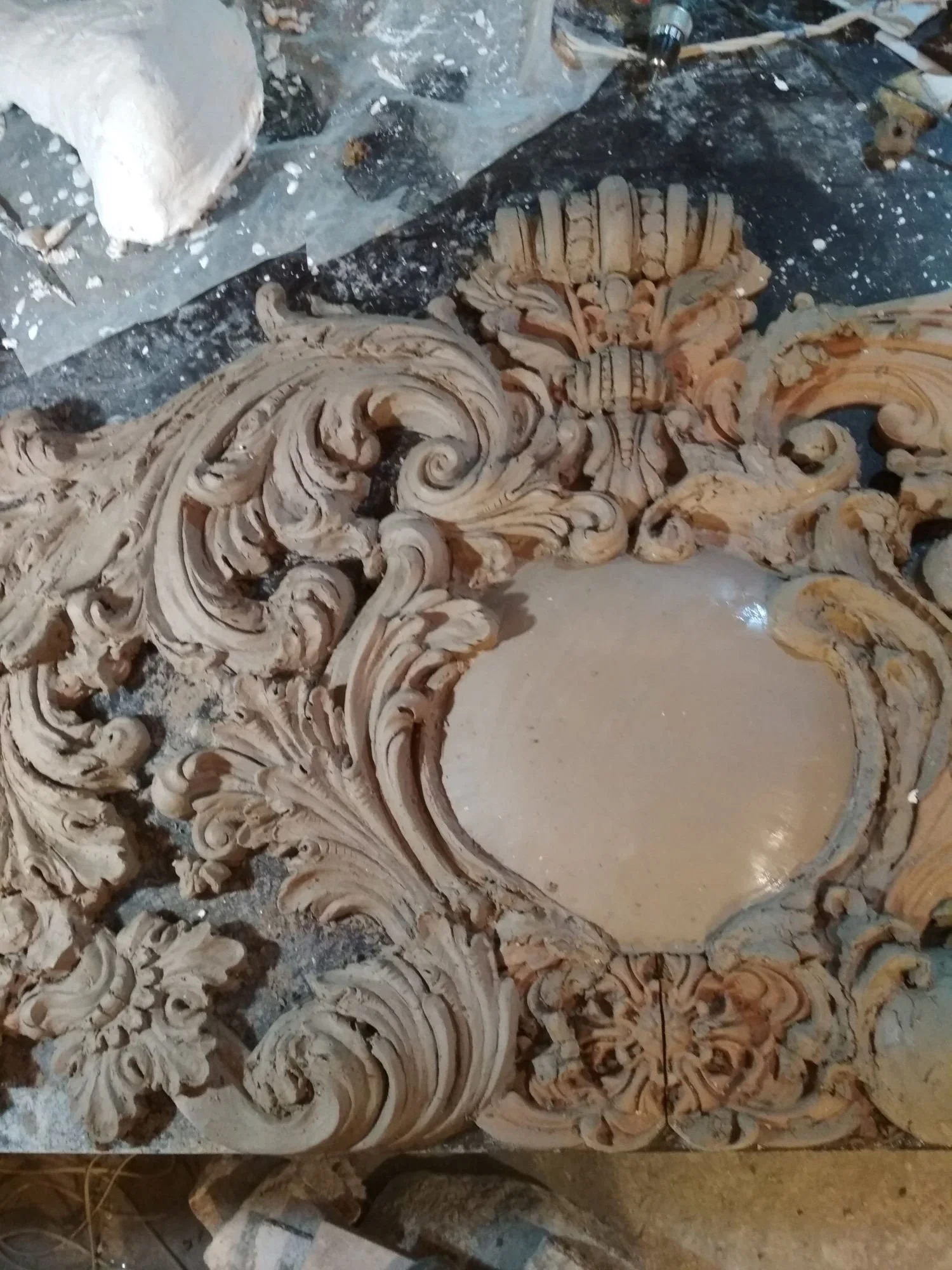 Zdjęcie przedstawia etap prac nad bogato zdobionym elementem dekoracyjnym. Jest to model wykonany w glinie rzeźbiarskiej lub plastelinie przemysłowej.