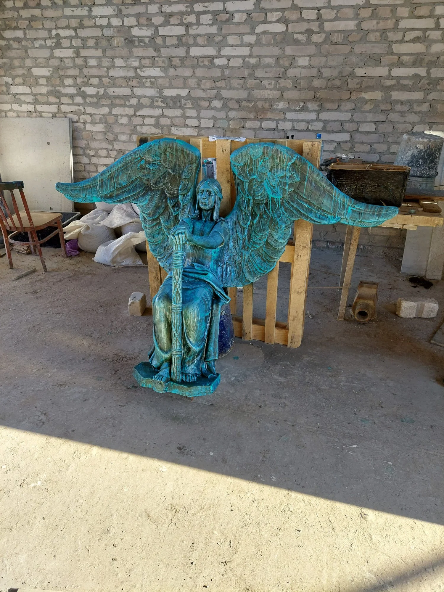 Figura anioła o turkusowo-morskiej patynie. Spokojna poza i rozpostarte skrzydła.