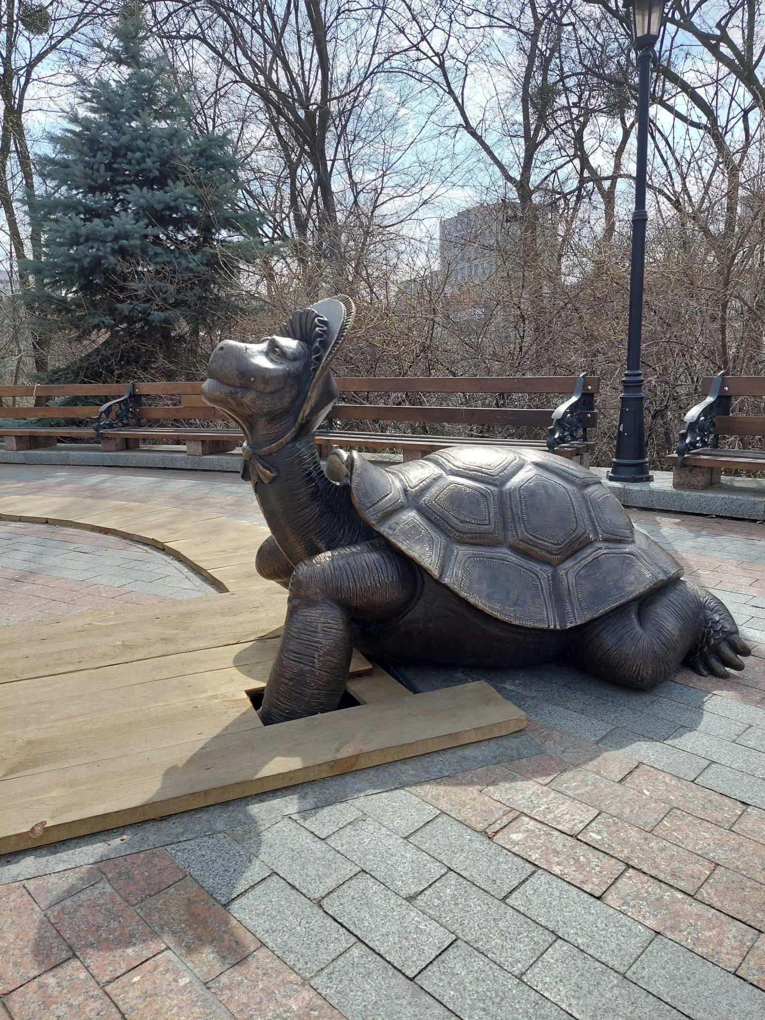 Zabawna i szczegółowa rzeźba żółwia stanowiąca unikalną ozdobę ogrodu lub parku. Wykonana z trwałych materiałów odpornych na warunki atmosferyczne.