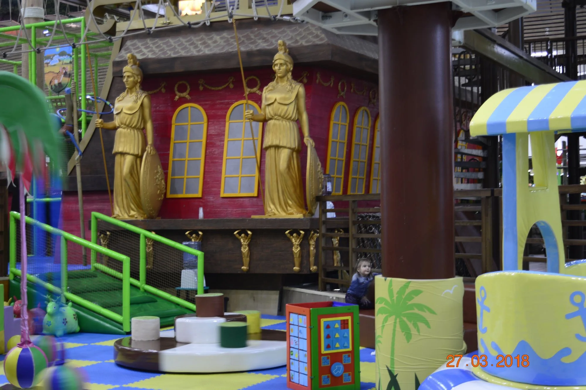 Zbliżenie na strefę zabaw stylizowaną na okręt piracki. Zdjęcie ukazuje dbałość o detale, które budują niepowtarzalną atmosferę w obiektach komercyjnych (sale zabaw, centra handlowe).