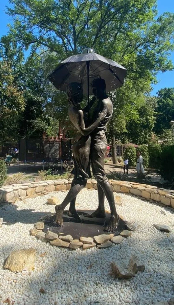 Niezwykle urokliwa i pomysłowa instalacja wodna, przedstawiająca młodą parę obejmującą się pod parasolem. Rzeźba ta wprowadza do przestrzeni miejskiej element romantyzmu i lekkości.