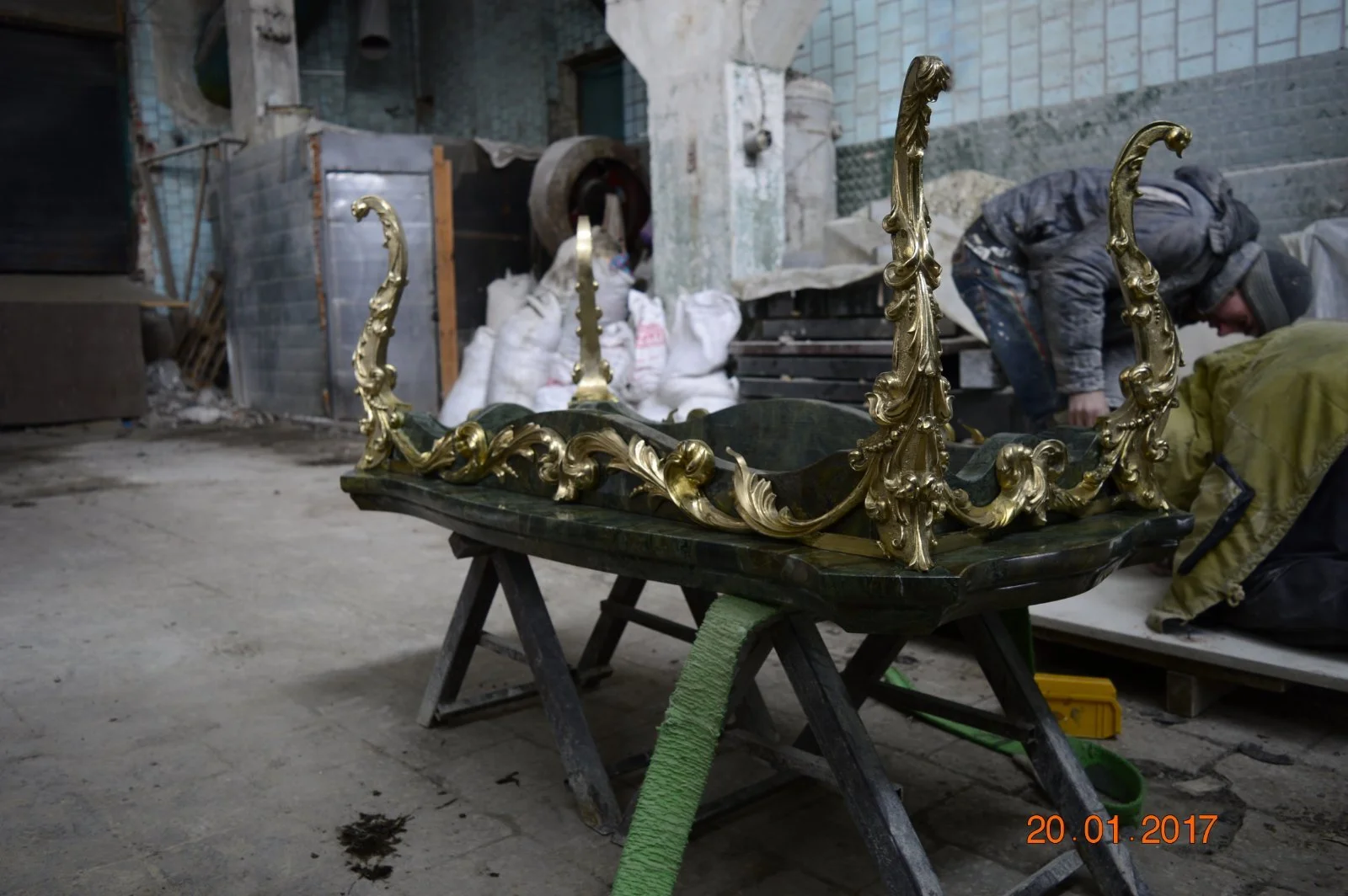 Zdjęcie dokumentacyjne z pracowni, przedstawiające proces montażu luksusowego stolika kawowego (widocznego w całości na innej fotografii).
