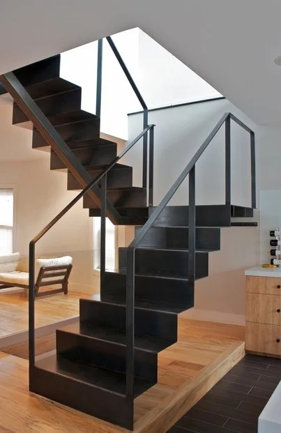 Schody o surowym, industrialnym charakterze. Pełne stalowe stopnie i prosta balustrada z profili idealnie pasują do wnętrz typu loft.