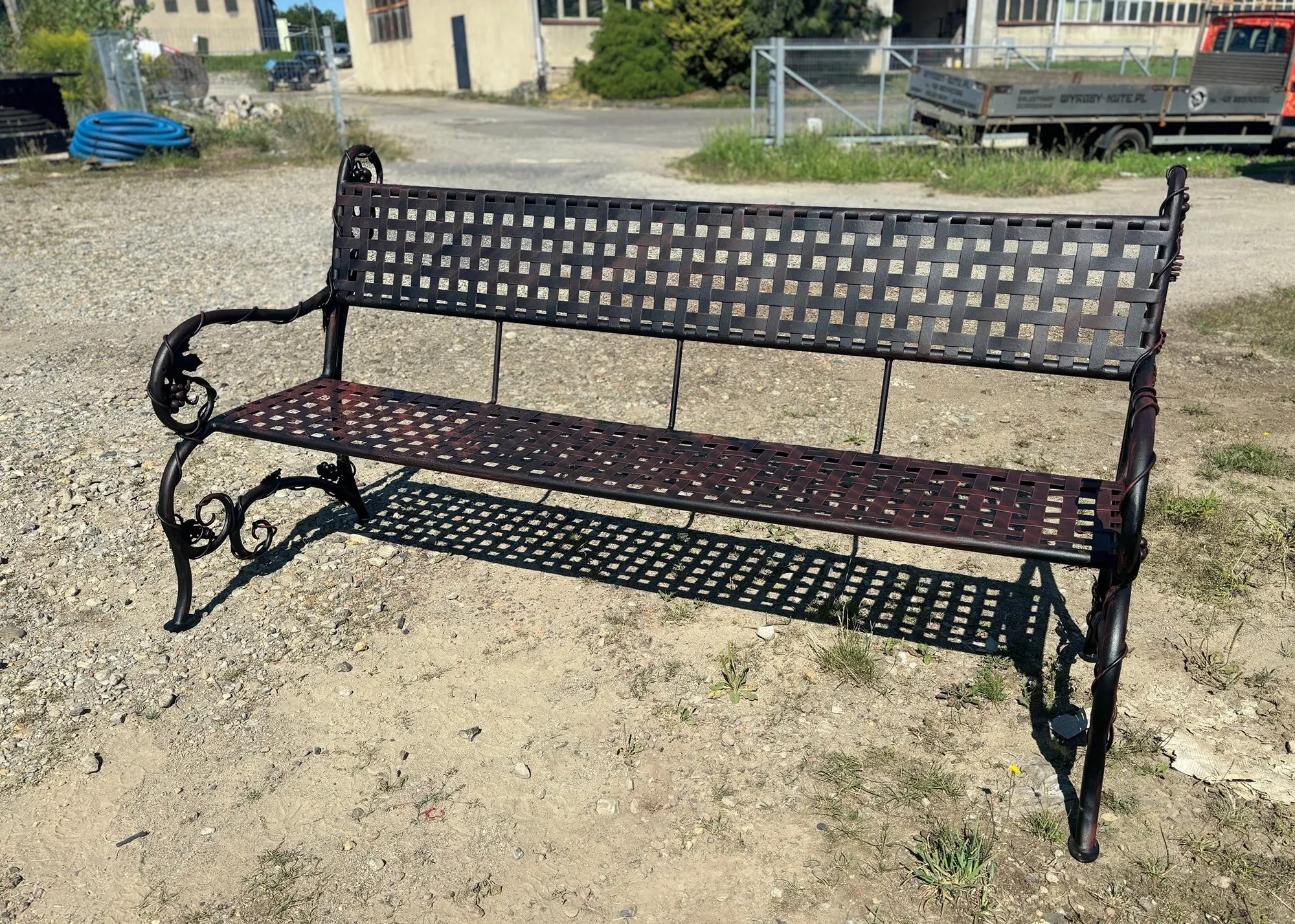Widok na cały projekt ławki, który łączy w sobie lekkość ażurowej plecionki z masywnością artystycznie zdobionej ramy.