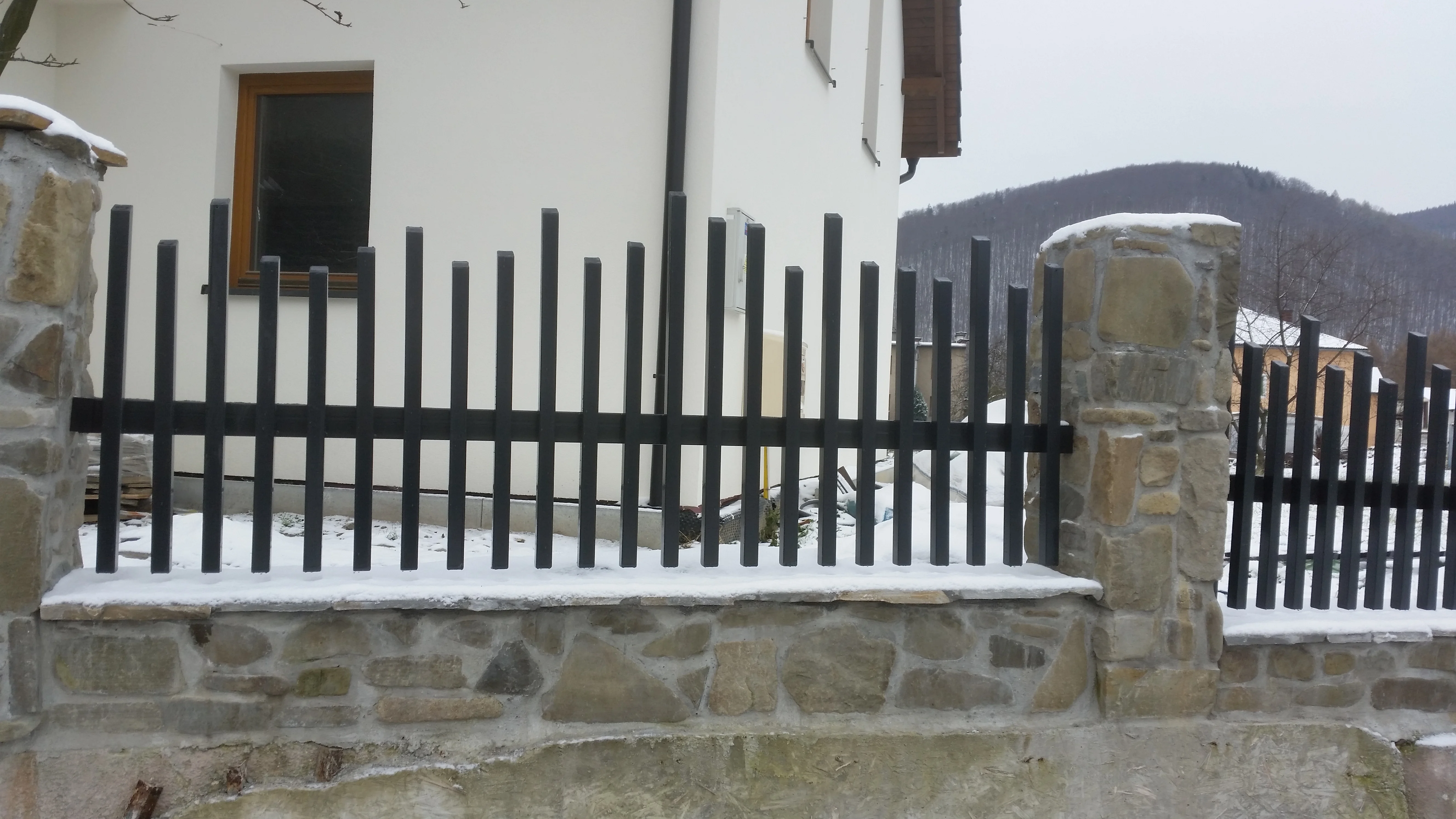 Realizacja pokazująca, jak świetnie **nowoczesne przęsła stalowe** komponują się z tradycyjną podmurówką z łupanego kamienia. Chłodny odcień profili (antracyt/czarny mat) stanowi elegancki kontrast dla jasnego piaskowca.