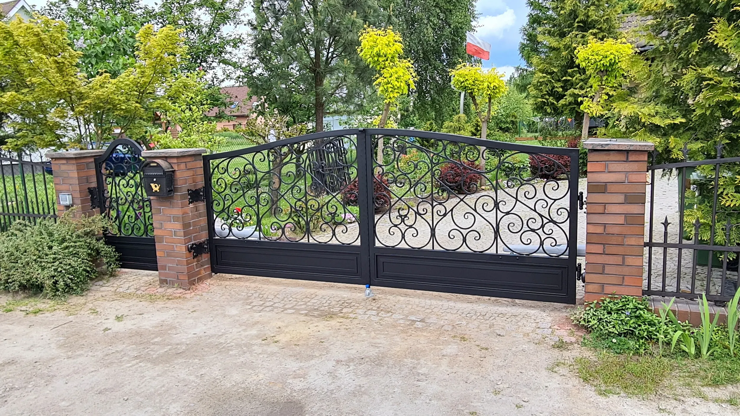 Widok na detale kutej bramy i furtki. Każdy element jest starannie wykonany, tworząc spójną i harmonijną całość ogrodzenia.