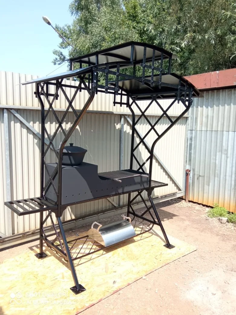 Kompletna stacja do gotowania na zewnątrz. Wyposażona w palenisko pod kociołek oraz dużą przestrzeń grillową, a wszystko to w artystycznej oprawie kutej.
