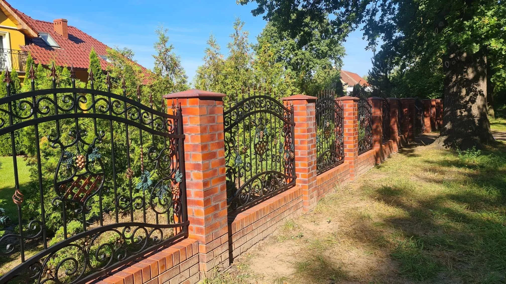 Widok wzdłuż linii ogrodzenia winogrona. Roślinne motywy kute ręcznie dodają posesji ciepła i prestiżu.
