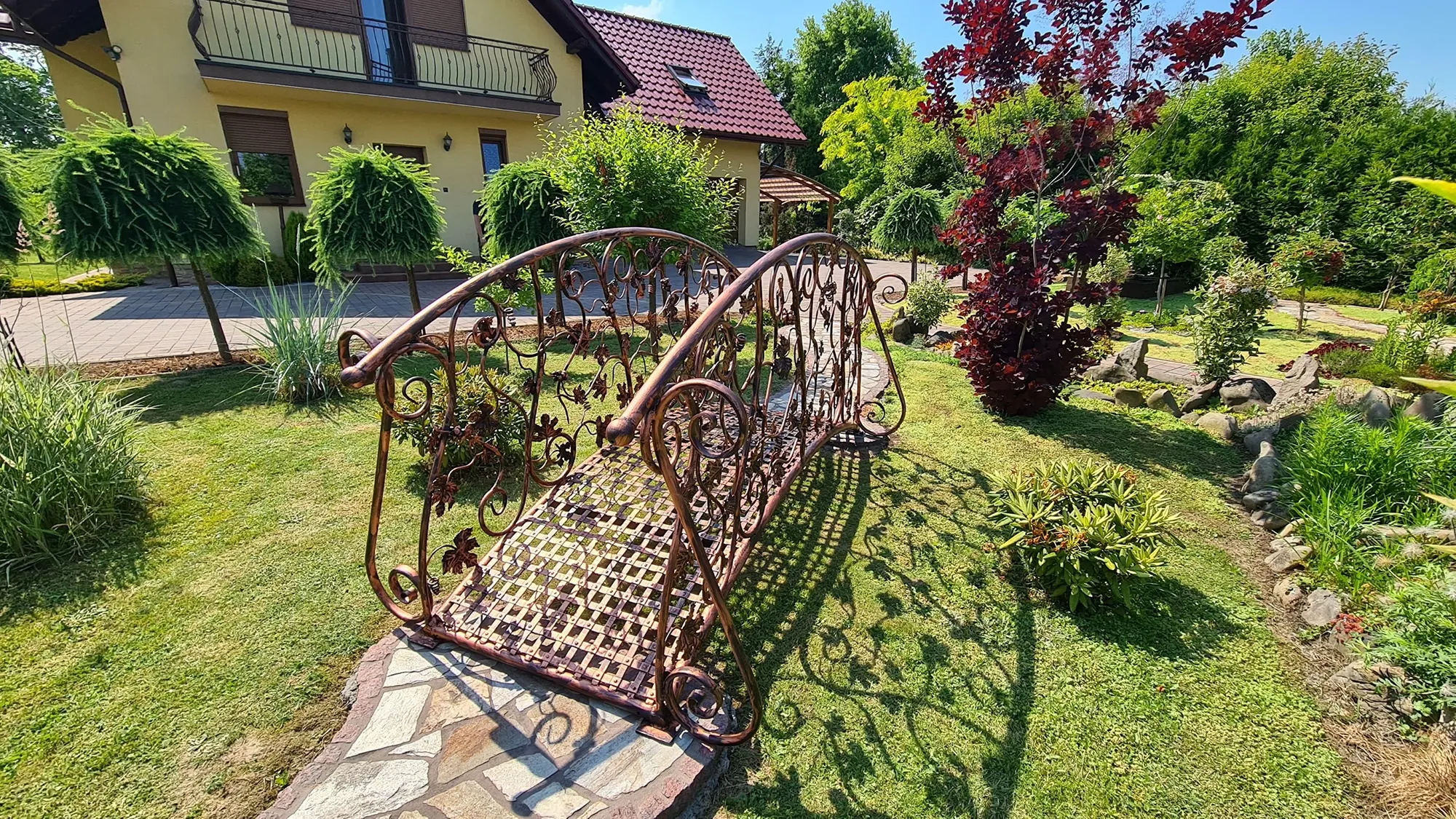 Kompletna realizacja mostka kute go w ogrodzie. Harmonijne połączenie metalu z naturą, tworzące wyjątkowy punkt centralny ogrodu.