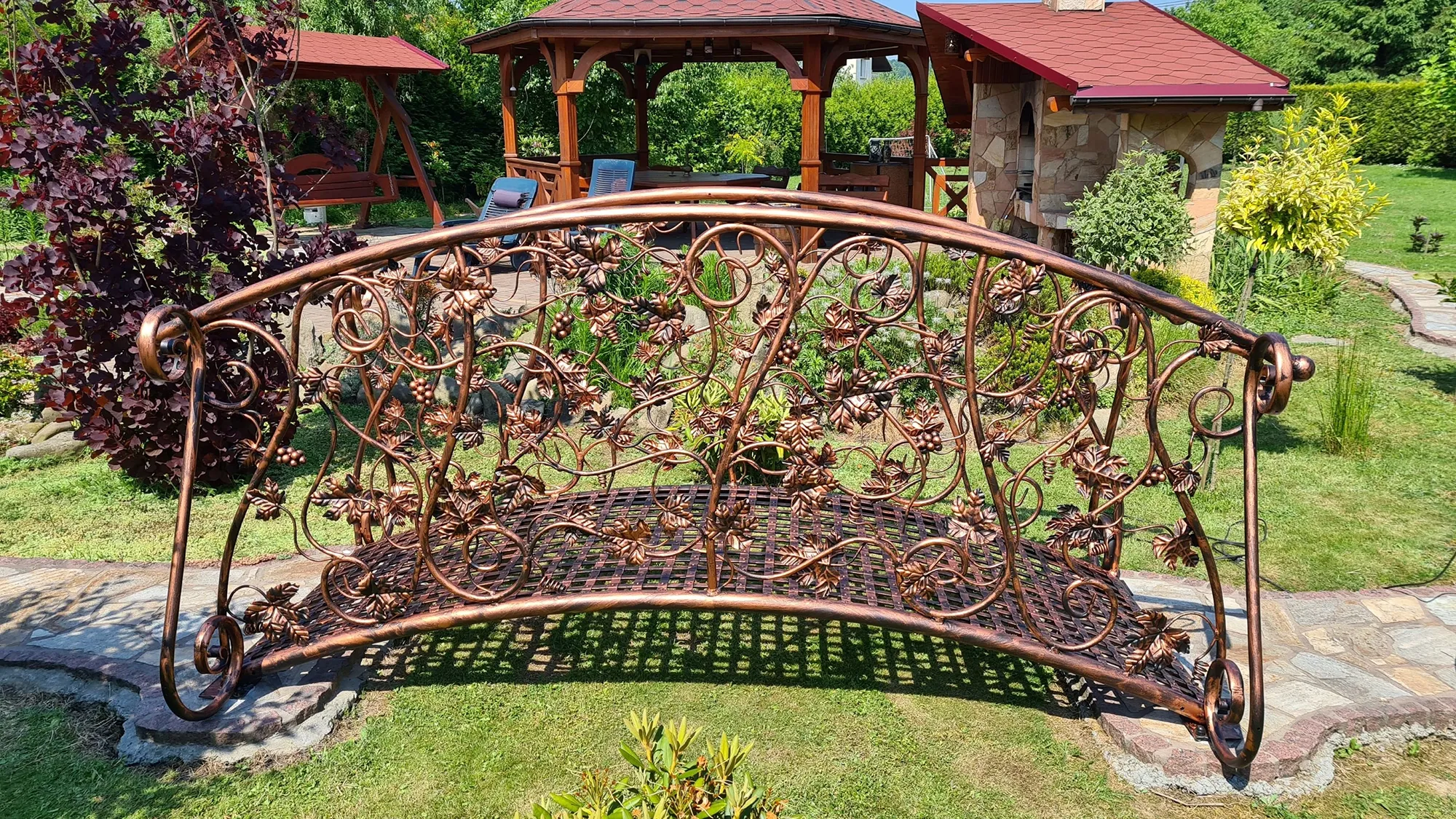 Artystyczny mostek do ogrodu, zdobiony ręcznie kuty mi liśćmi i gronami winorośli. Piękna i funkcjonalna dekoracja nad oczko wodne.