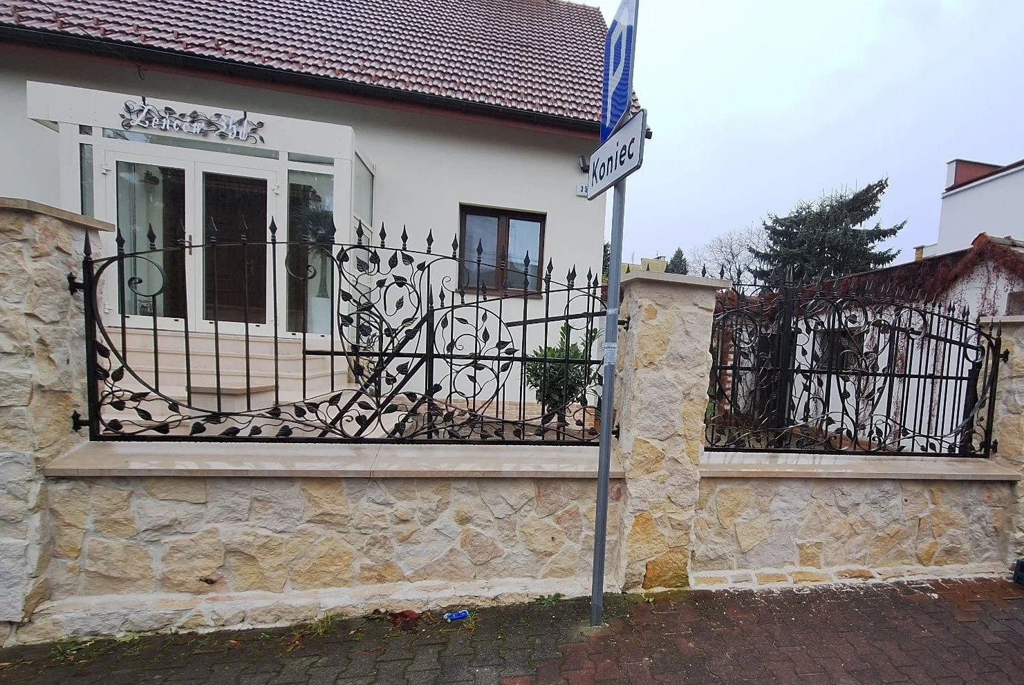 Kompletna realizacja ogrodzenia frontowego, gdzie kute gałązki z liśćmi tworzą lekką i efektowną barierę, idealnie harmonizującą z jasną elewacją i kamiennymi słupami.
