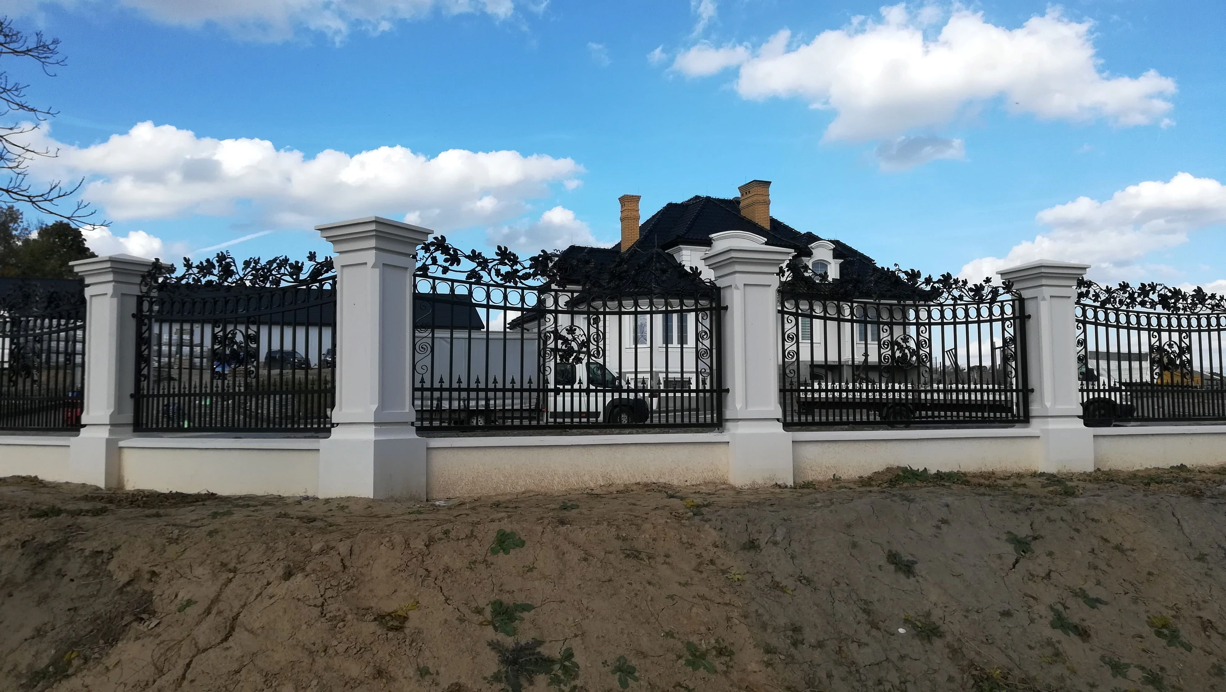 Imponujące ogrodzenie frontowe z kutymi przęsłami o motywach roślinnych, osadzone na masywnych, białych filarach. Idealne dla luksusowych posiadłości.