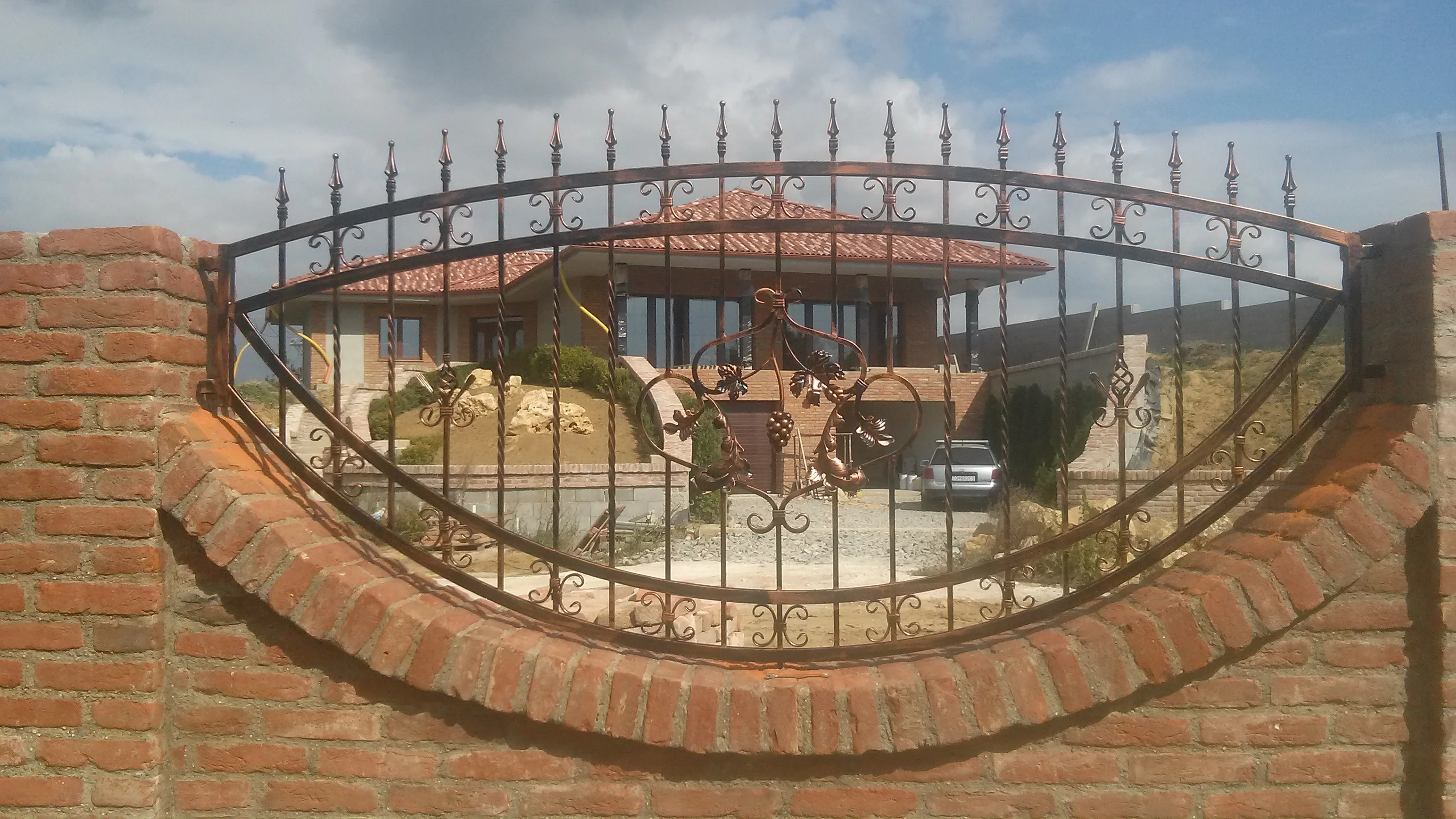 Prezentujemy realizację **ogrodzenia kutego** zamontowanego na solidnej podmurówce i słupkach z cegły. Przęsła mają elegancki, łukowy kształt, który nadaje całości dynamiki i lekkości.