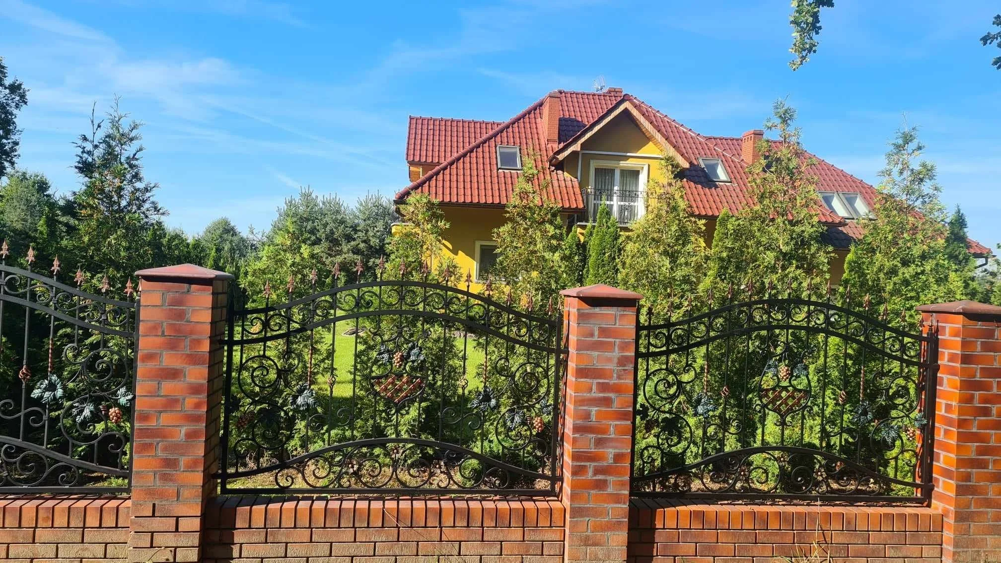 Przęsła ogrodzeniowe z motywem winorośli, osadzone na solidnych słupach z cegły klinkierowej.