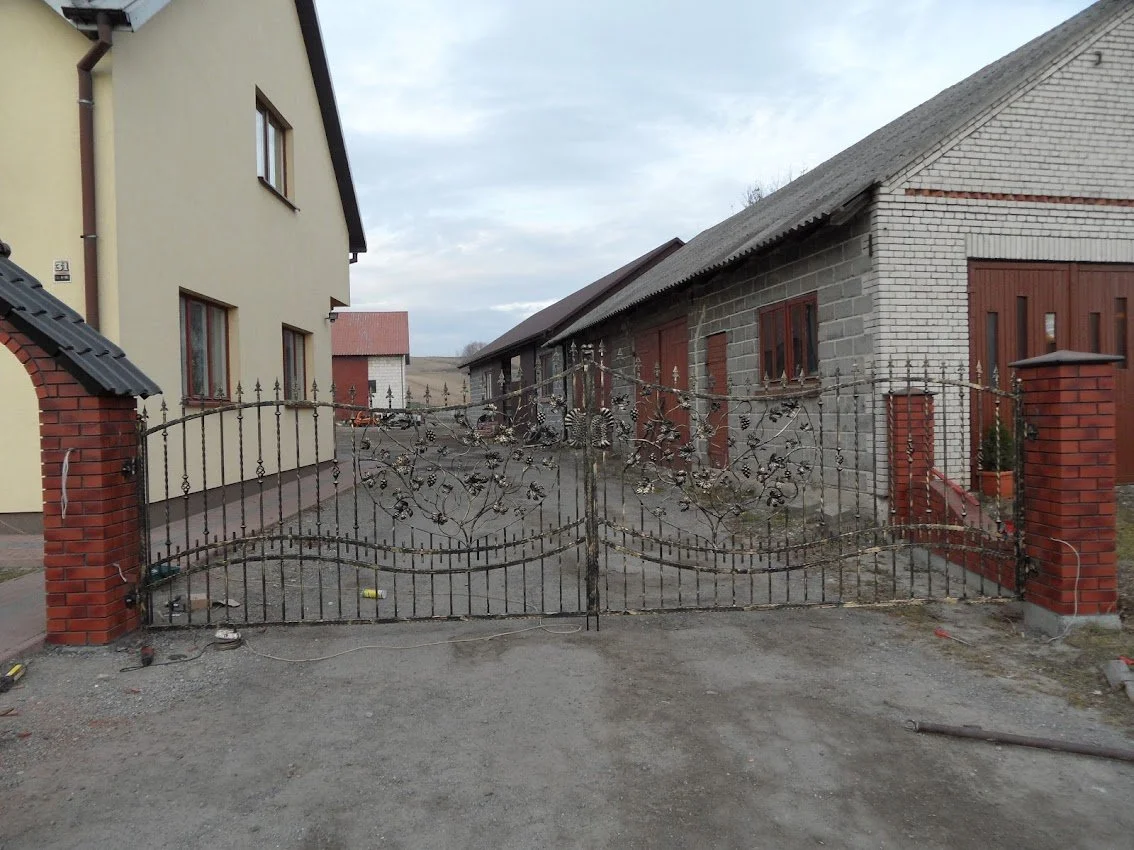 Efektowna linia ogrodzenia z podmurówką o kształcie fali. Kute winogrona harmonizują z dynamiczną formą muru.
