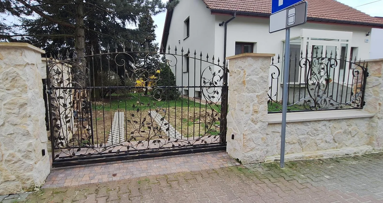 Kompletne rozwiązanie ogrodzeniowe, które łączy w sobie surowość kamiennych słupów z Finezją kutych przęseł.