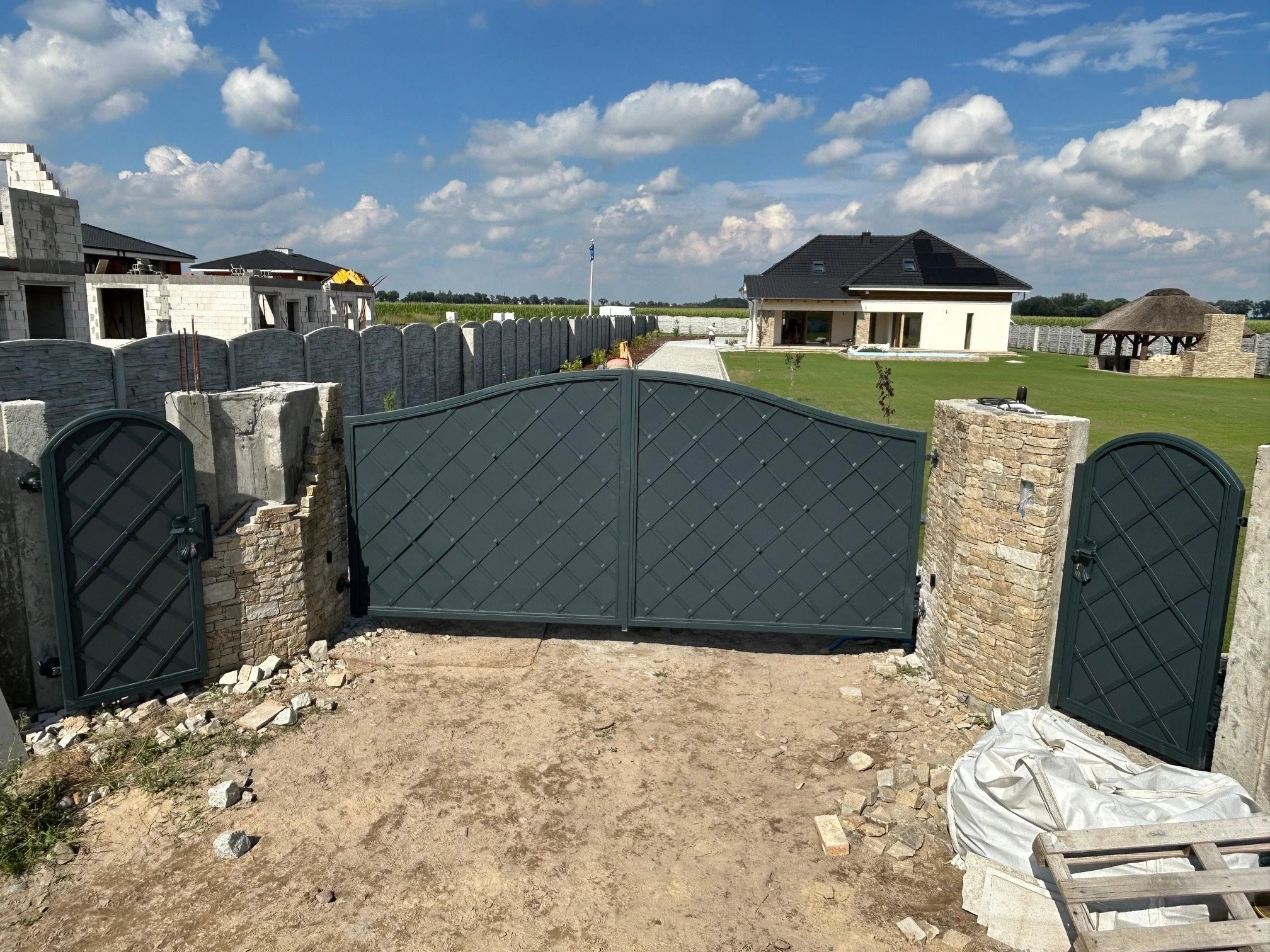 Widok ogólny na nowoczesną posiadłość, gdzie system diamentowych wrót kowalskich definiuje luksusowy charakter całego frontu.