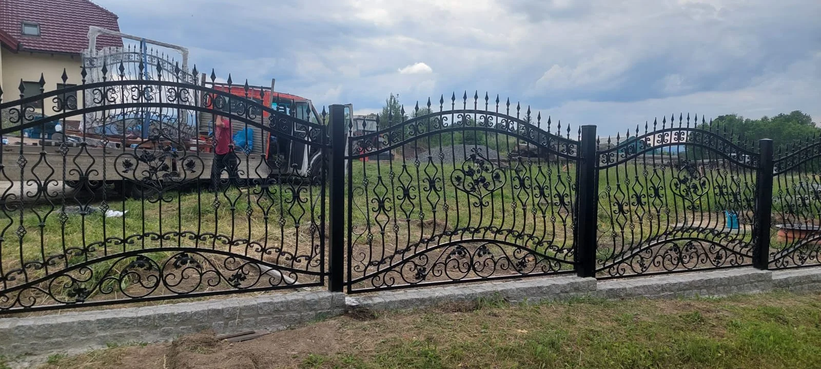 Szczegółowe spojrzenie na kunszt kowalski ukryty w pojedynczych segmentach ogrodzenia.
