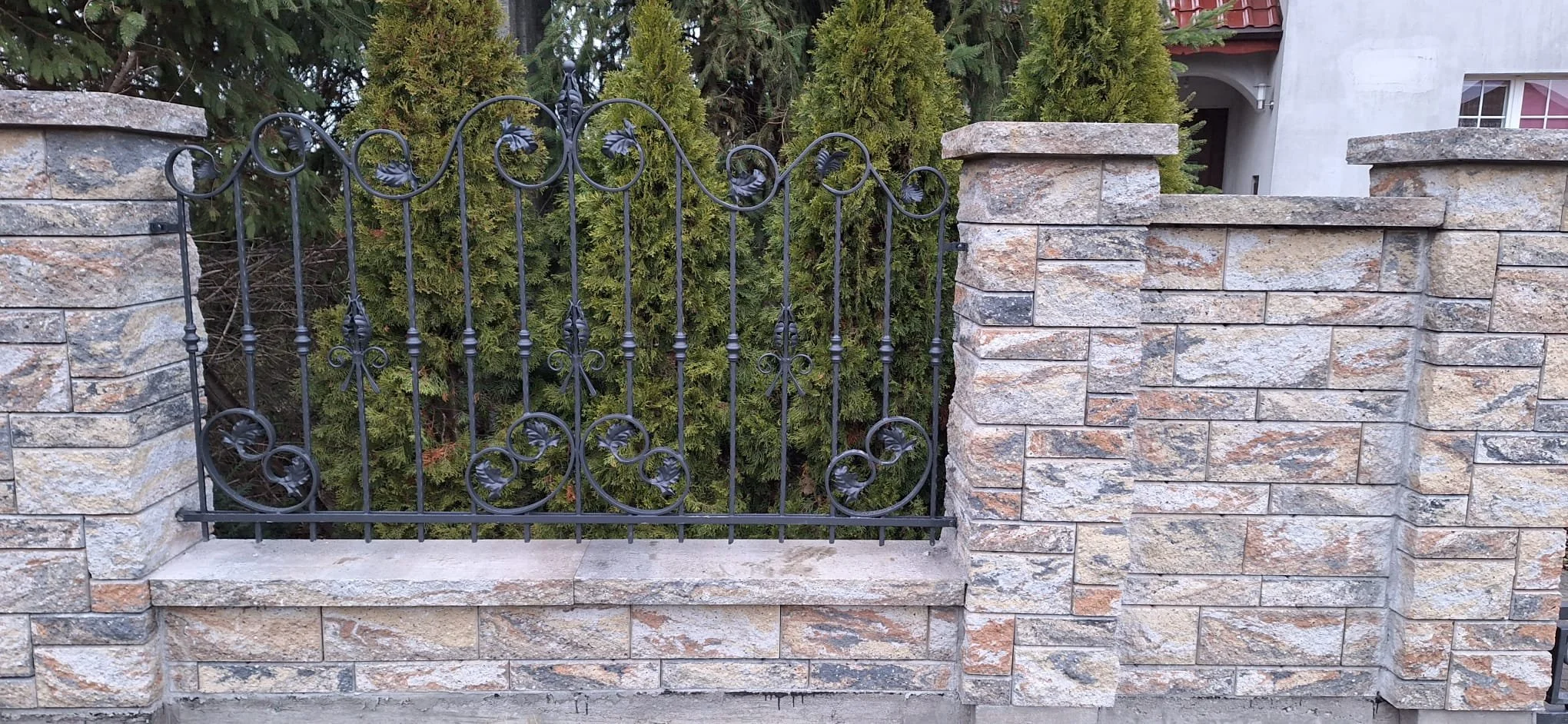 Przęsło ogrodzenia kute - esownice i liście - kamień