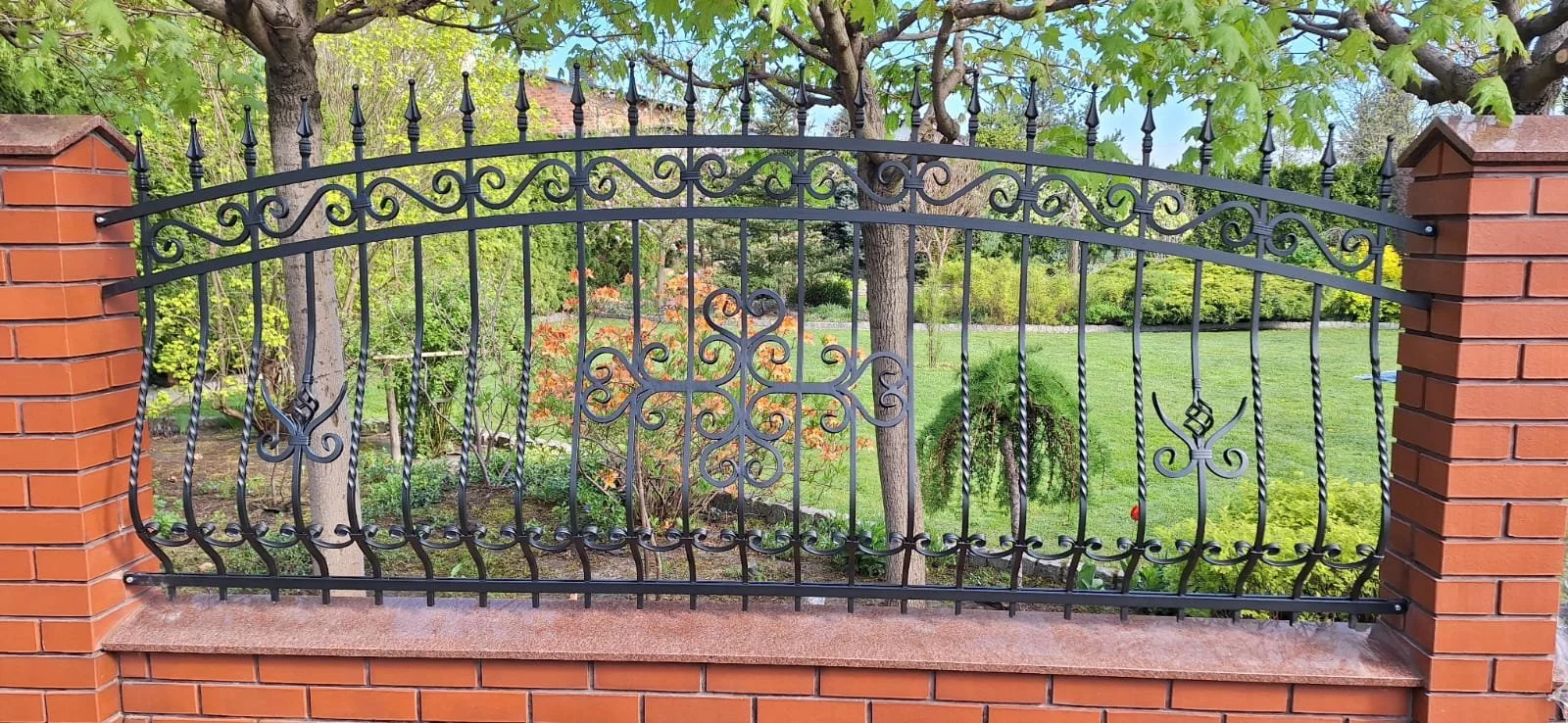 Klasyczne ogrodzenie kute, które dzięki centralnemu zdobieniu nabiera lekkości i unikalnego charakteru.