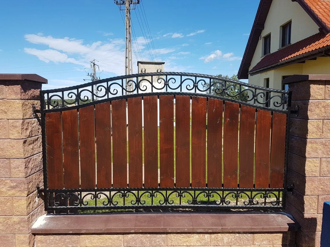 Moduł ogrodzenia łączący estetykę kowalstwa artystycznego z deskami drewnianymi. Solidne i efektowne rozwiązanie.