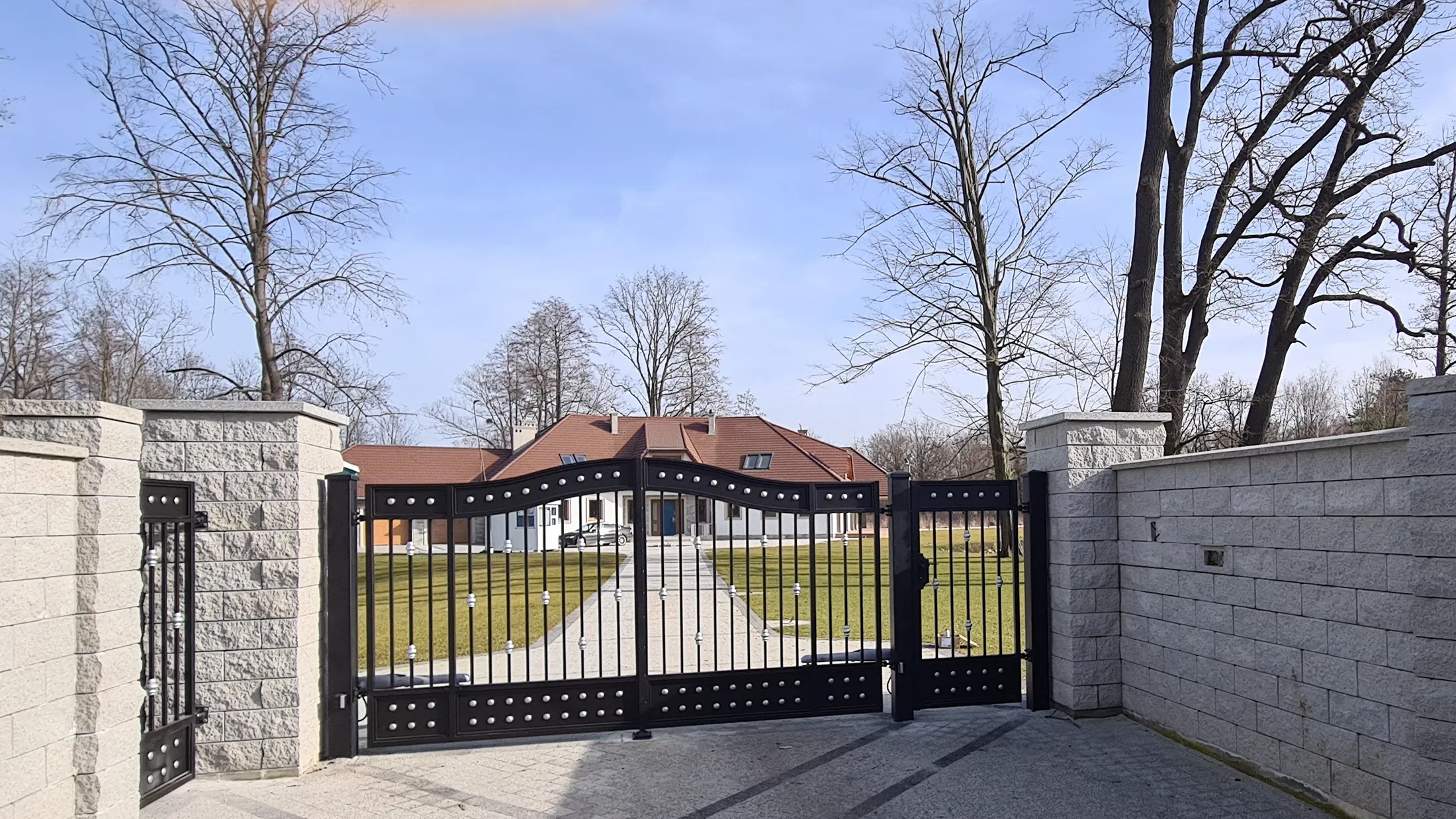 Widok na kompletną bramę i furtkę kuta zamontowaną na solidnych słupach z bloczków łupanych. Profesjonalna realizacja i montaż.