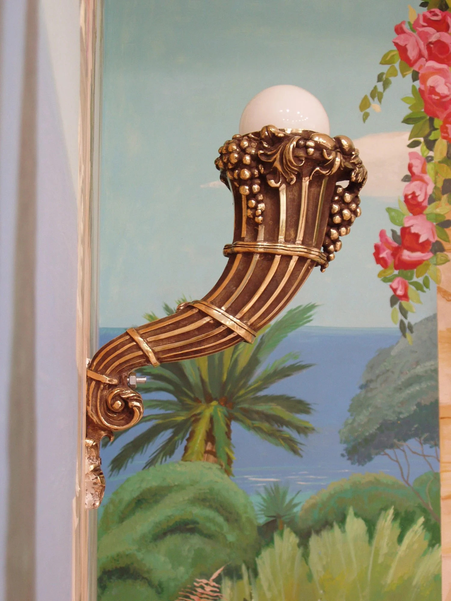 Kunsztownie wykonana lampa ścienna (kinkiet) w formie rogu obfitości. Jest to klasyczny motyw dekoracyjny, symbolizujący bogactwo i szczęście.