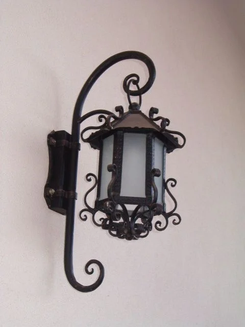 Widoczny na zdjęciu **kinkiet kuty** to przykład naszej dbałości o konstrukcję i estetykę. Solidna płyta montażowa zapewnia stabilność lampy na elewacji, a ozdobne pręty tworzą kosz chroniący i dekorujący szklany klosz.
