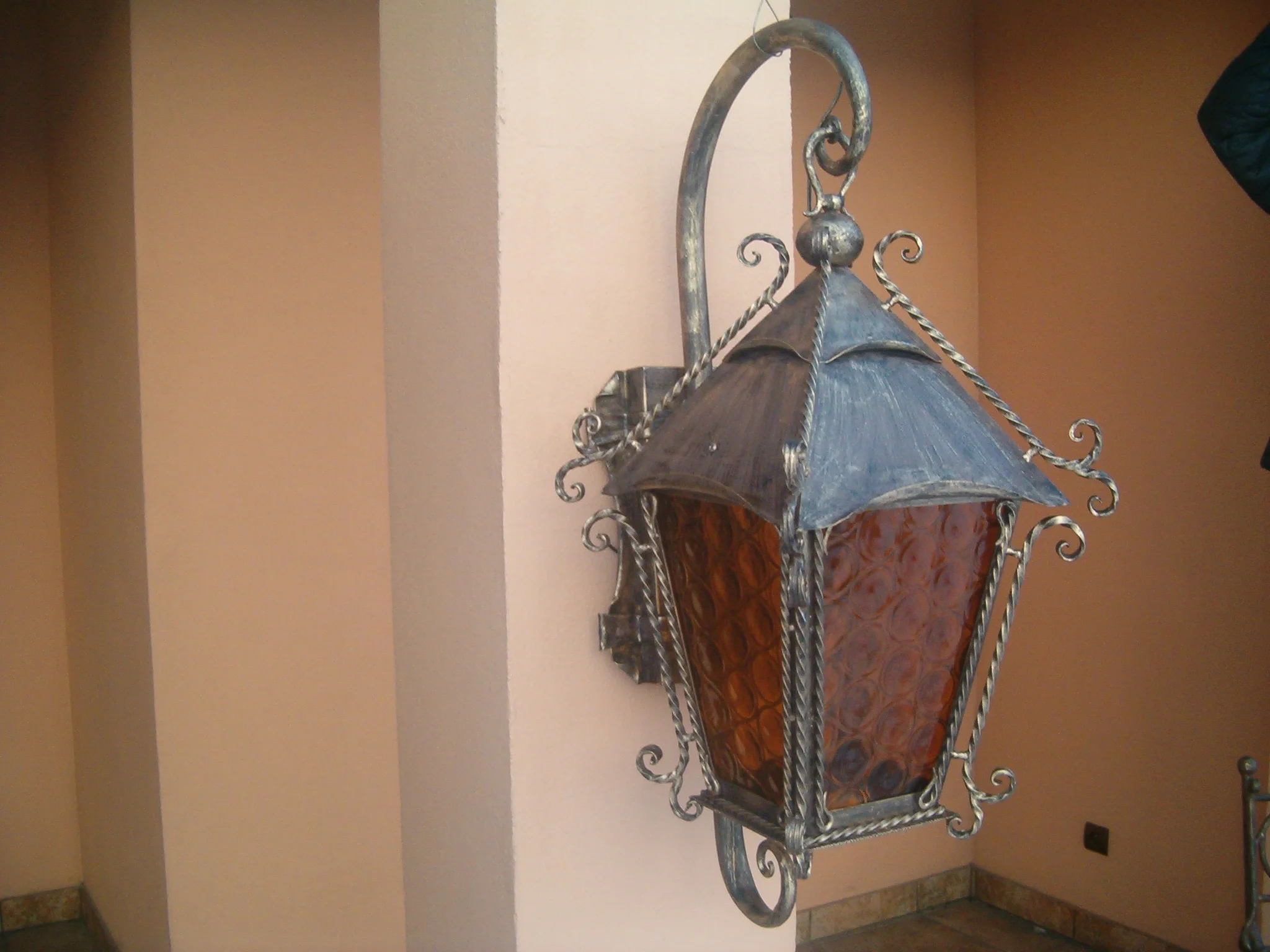 Klimatyczna **lampa wisząca** stylizowana na starą latarnię. Charakterystyczne, bursztynowe szybki w połączeniu z patynowaną stalą dają miękkie, ciepłe światło, idealne do stworzenia nastroju na tarasie czy w altanie.