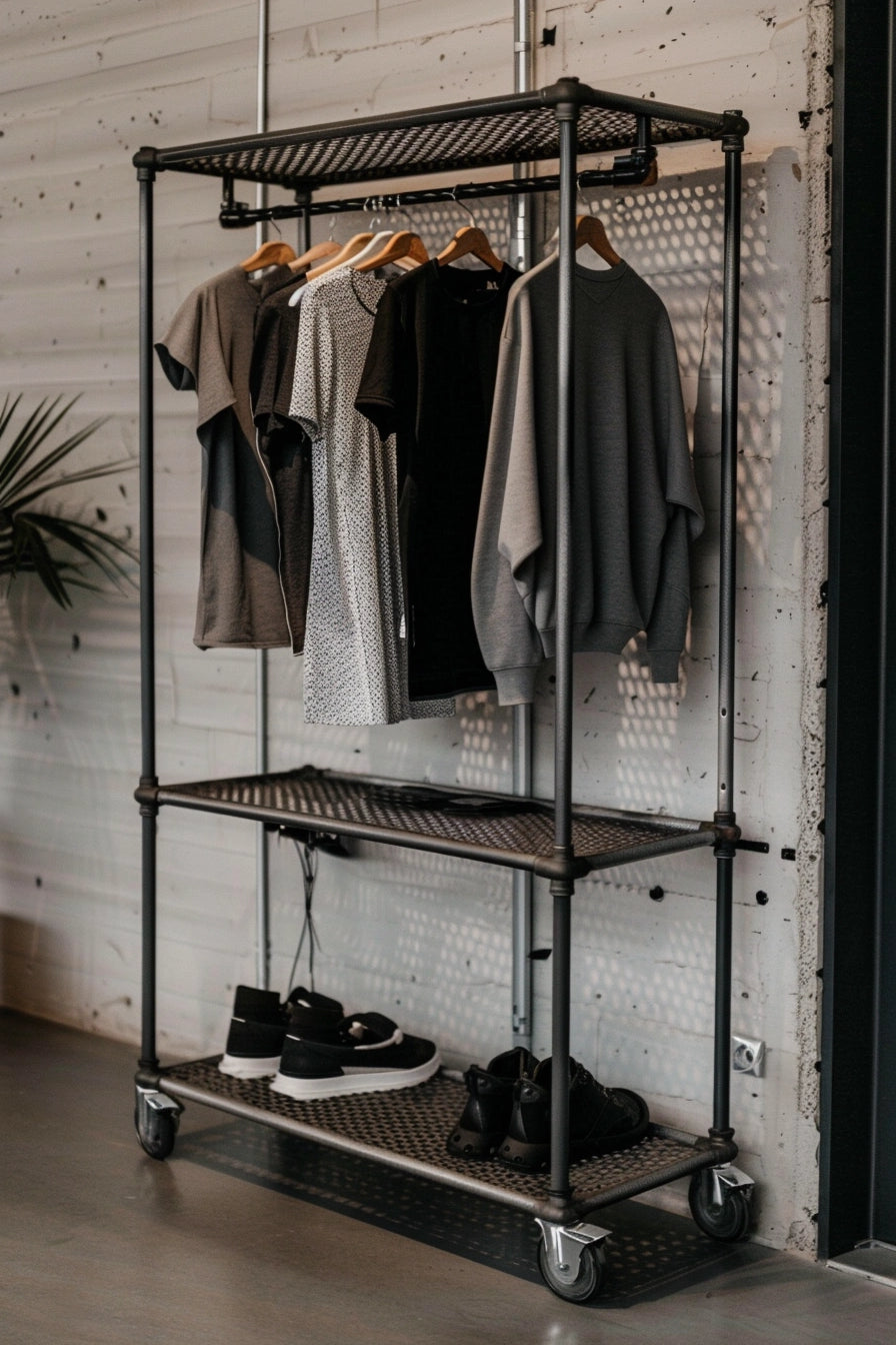 Minimalistyczny wieszak ubraniowy z siatką na kółkach