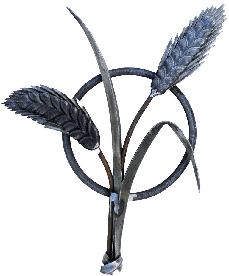 Artystyczny detal wykonany ze stali, przedstawiający dojrzałe kłosy zboża wpisane w okrąg. Idealny jako ozdoba ściany lub element bramy.