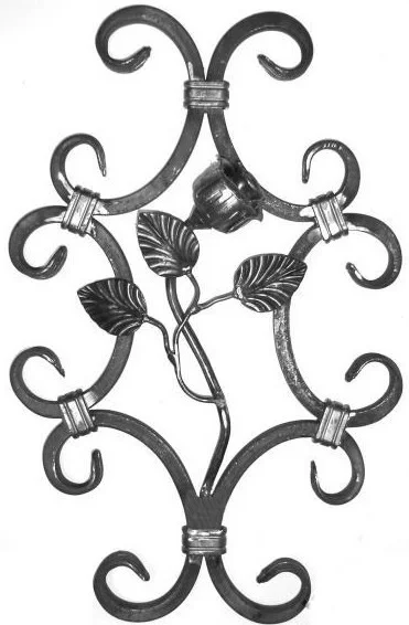 Klasyczna forma rozety wydłużonej. Symetryczne spirale (C-owniki) tworzą ramę dla naturalistycznie kutego środka przedstawiającego łodygę z liśćmi i pąkiem kwiatowym.