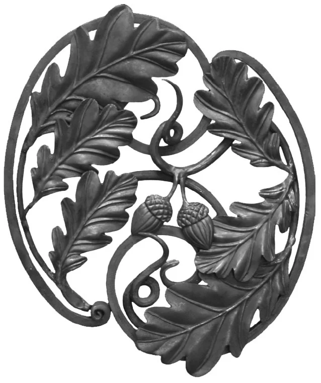 Unikalny element ozdobny w formie medalionu z motywem dębowym. Ręczna robota, która nada charakter każdemu ogrodzeniu czy bramie.