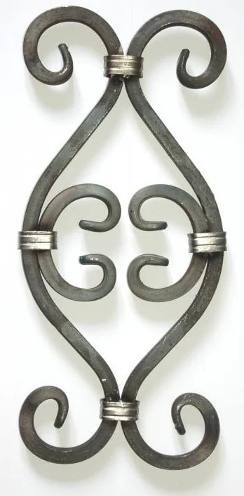 Element przeznaczony do montażu w pionowych podziałach ogrodzeń lub balustrad. Gięte płaskowniki tworzą atrakcyjny wizualnie, lustrzany wzór, przypominający stylizowane serca lub liry.