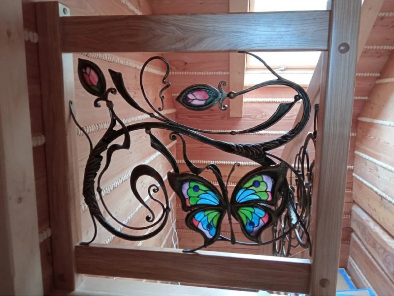 Niezwykła realizacja w domu z bali, gdzie kuta stal spotyka się z kolorowym szkłem. Motyw motyla z rozpostartymi skrzydłami stanowi serce balustrady, wprowadzając do wnętrza lekkość i baśniowy klimat.