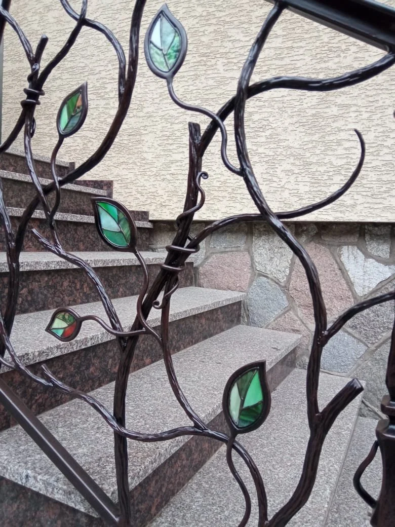 Zbliżenie na kunsztownie wykonaną gałąź i szklany detal. Wyroby-kute.pl to miejsce, gdzie metal spotyka się ze sztuką.