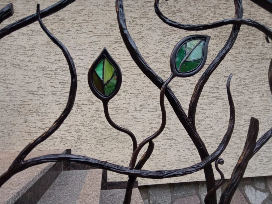 Zbliżenie na precyzyjnie wykonane liście witrażowe wkomponowane w stalową strukturę balustrady. Mistrzowskie połączenie materiałów.