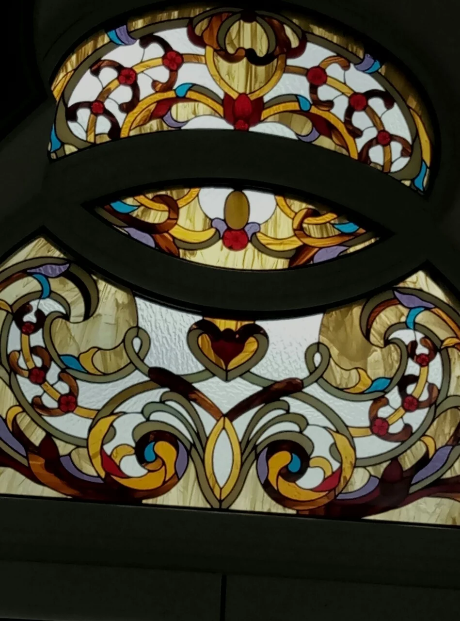 Zbliżenie na centralną lub boczną część plafonu. Uwagę zwraca eliptyczny kształt ("oko"), który jest częstym motywem w secesji. Kolorystyka ciepła, oparta na bursztynach, czerwieniach i błękitach.