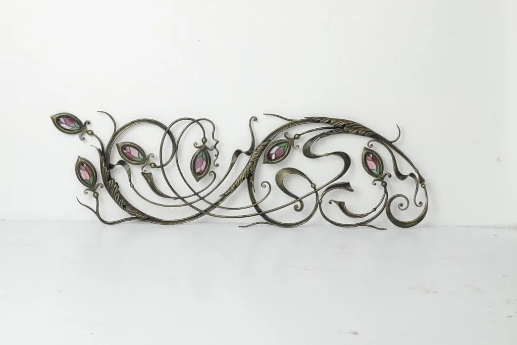 Detal balustrady ukazujący finezję wykonania. Stalowe łodygi płynnie przechodzą w oprawy dla szklanych elementów. Witrażowe pąki kwiatowe w kolorze różu/fioletu dodają kompozycji lekkości i koloru.