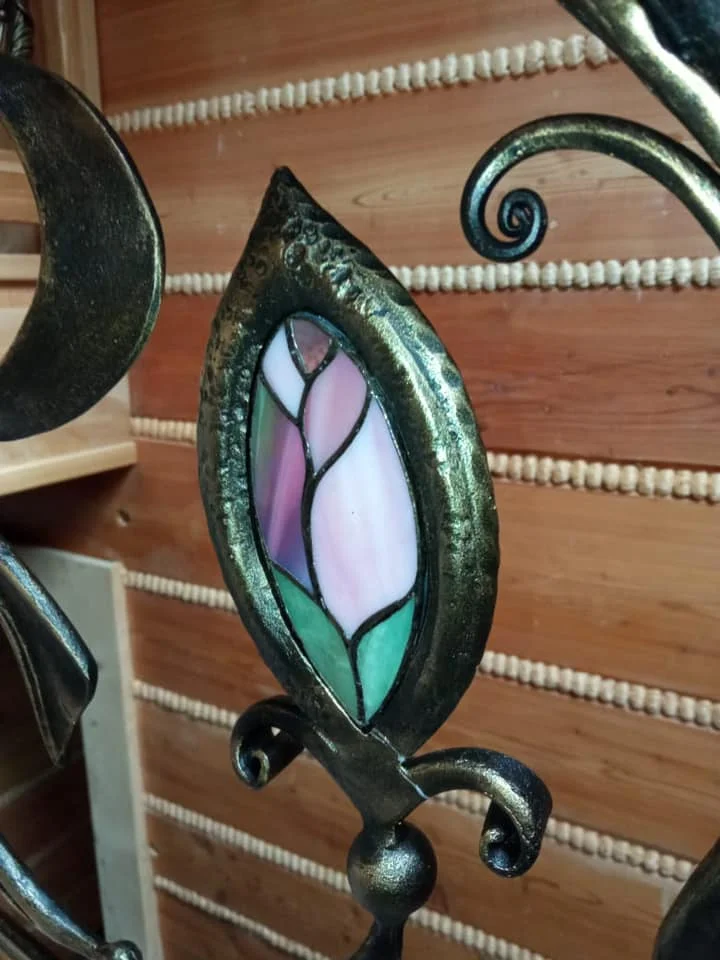 Wyjątkowy detal kowalski, w którym stalowa rama w kształcie pąka róży została wypełniona ręcznie docinanym szkłem witrażowym. Harmonijne połączenie surowości metalu z delikatnością światła przenikającego przez szkło.