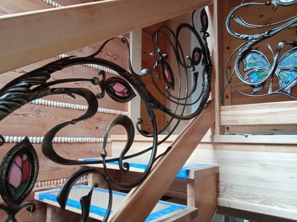 Schody Drewniane z Balustradą Witrażową - Detal