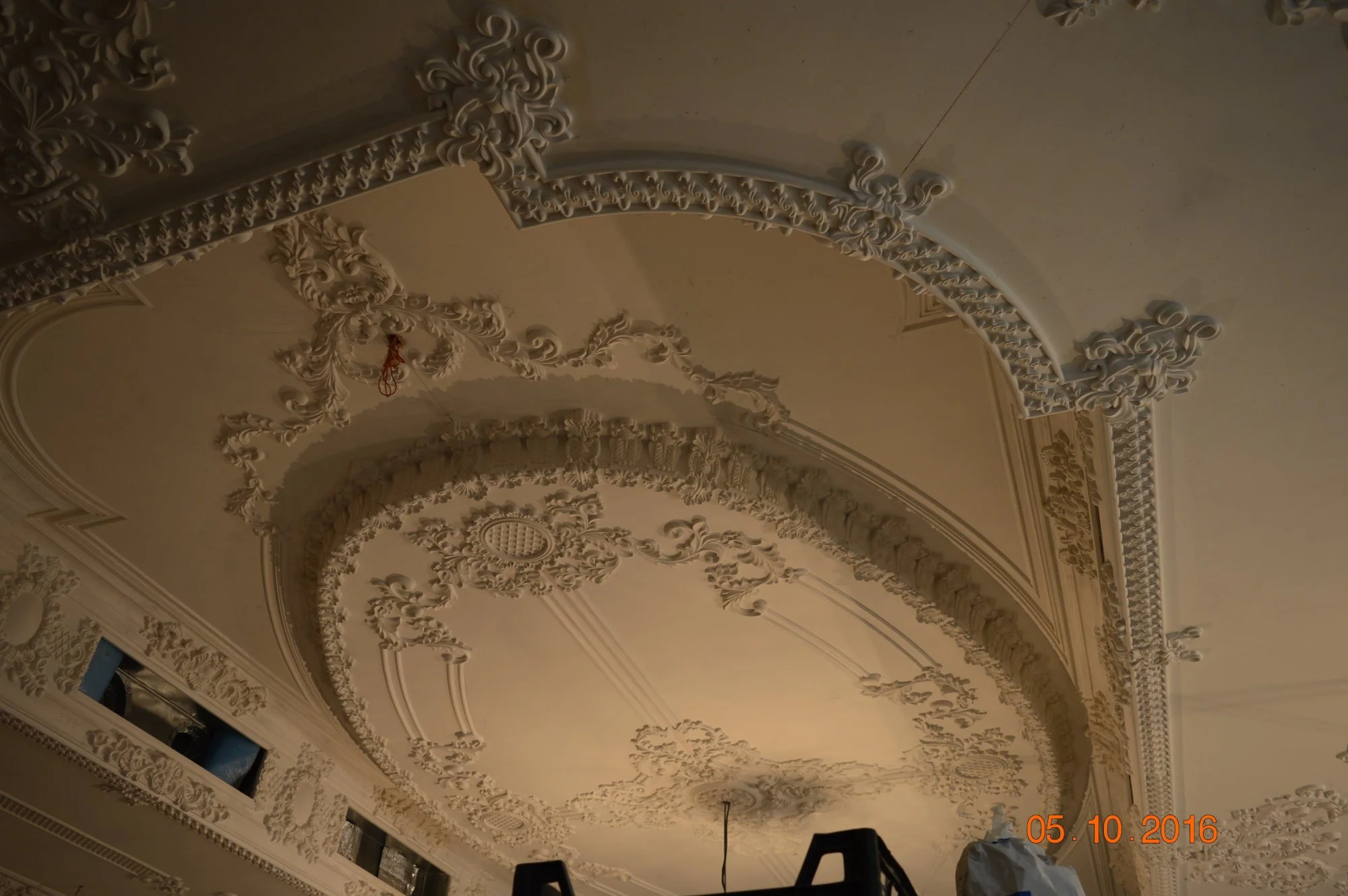 Widok na sufit (prawdopodobnie w trakcie prac wykończeniowych), który został podzielony na strefy za pomocą sztukaterii.