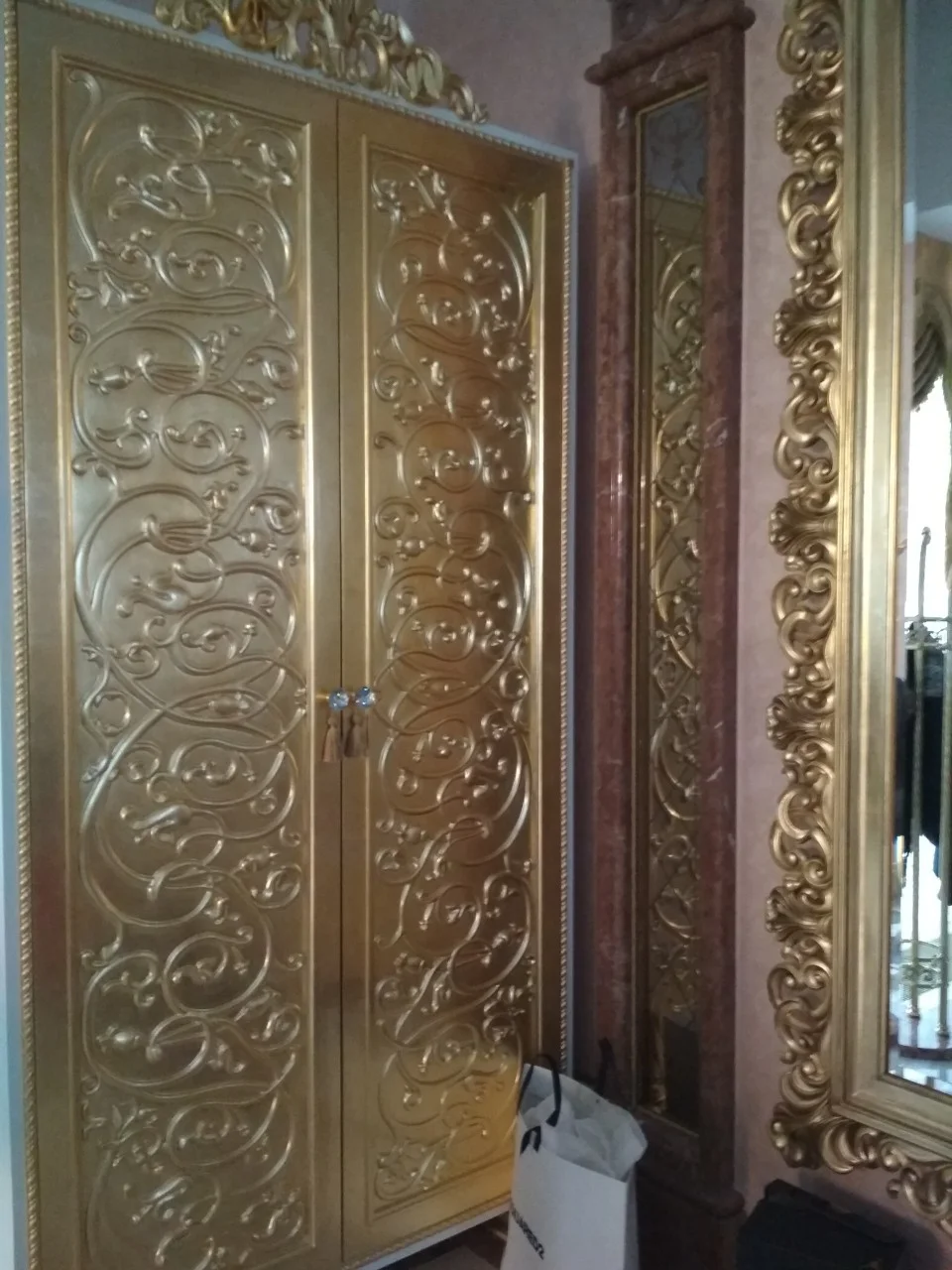 Niezwykle efektowny element wyposażenia wnętrza. Powierzchnia skrzydeł jest w całości pokryta złotym wykończeniem i zdobiona wypukłym wzorem roślinnym. Stylistyka nawiązuje do przepychu orientu lub art déco.